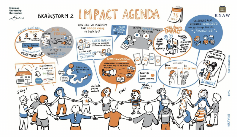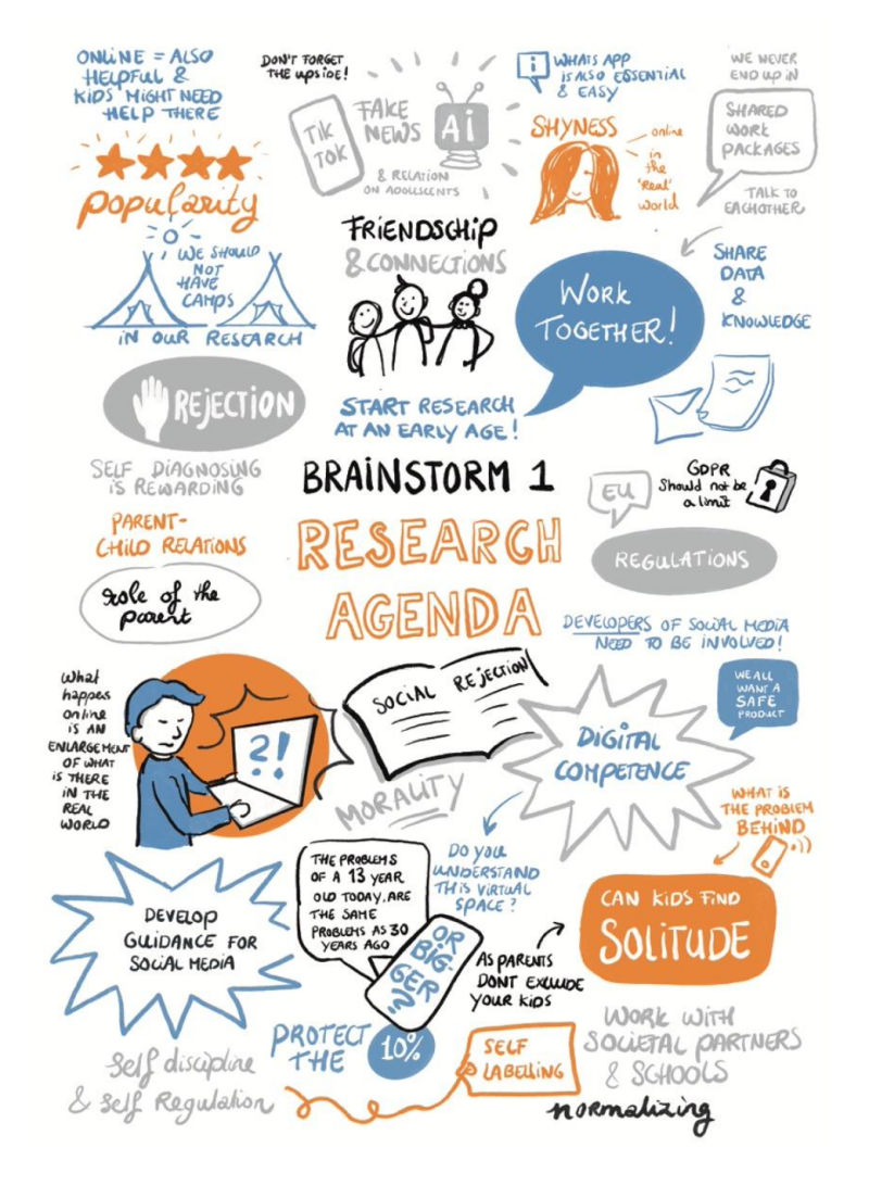 Three leading scholars gave presentations regarding their work on developmental sensitivities in social rejection: Prof. Dr. Eveline Crone from Erasmus University Rotterdam shared insights from Developmental Neuroscience; Dr. Amy Orben from the University of Cambridge shared insights from Developmental Psychology; and Prof. Dr. Patti Valkenburg from University of Amsterdam shared insights from Media Studies. The keynotes were visually summarised by Ineke Neutelings (Inktvisie), Puck ten Kate (Sketchworks) and Gijs Copic (Copic Business Cartoons) and can be viewed in detail here.